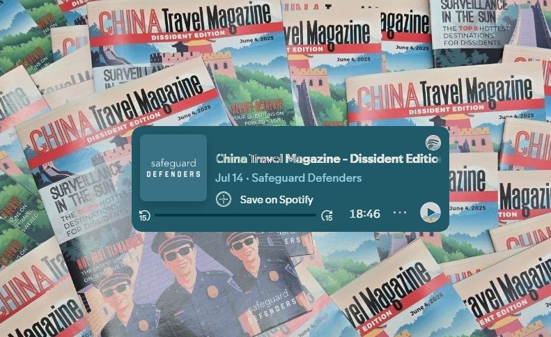 In Safeguard Defenders' very first podcast, as yet another means of making key information available outside of regular reports or releases, we delve deeper into how Chinese police take dissidents on forced holidays at politically sensitive times. The China Travel Magazine - Dissident Edition, published as a glossy, satirical, travel magazine, is being distributed around the world, having hit 48 cities in 24 countries on five continents (and counting), populating train stations, airport lounges, gyms, doctors' waiting rooms, cafes, libraries, and more.